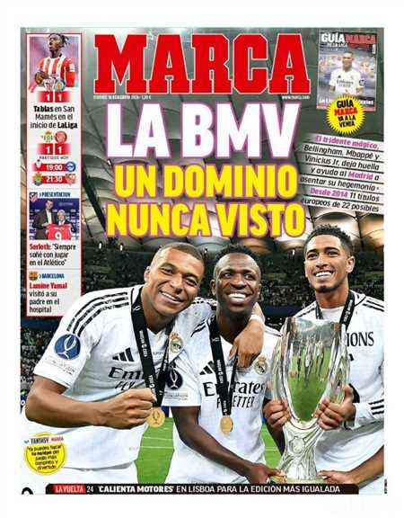 赛后,人们都在讨论贝林厄姆、姆巴佩和维尼修斯的三人组,《马卡报》的头版标题是“bmv组合,前所未有的统治”。封面图片直接将四人合影中的罗德里戈截掉。